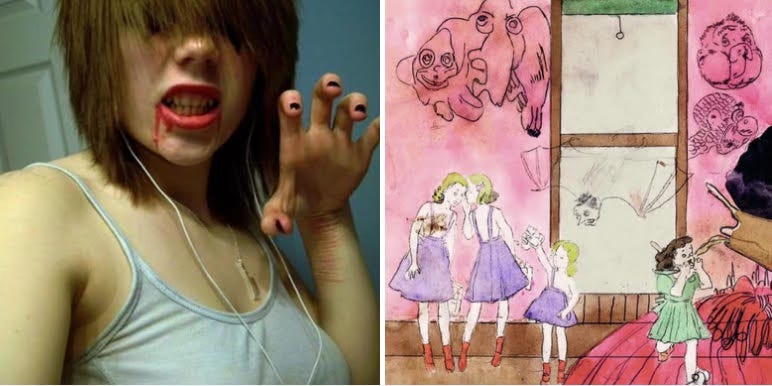 I join her in the mirror. My face is her face is mine, but mine is frowning deeply, and she is laughing like a fucking maniac, smearing hand soap onto her forehead.